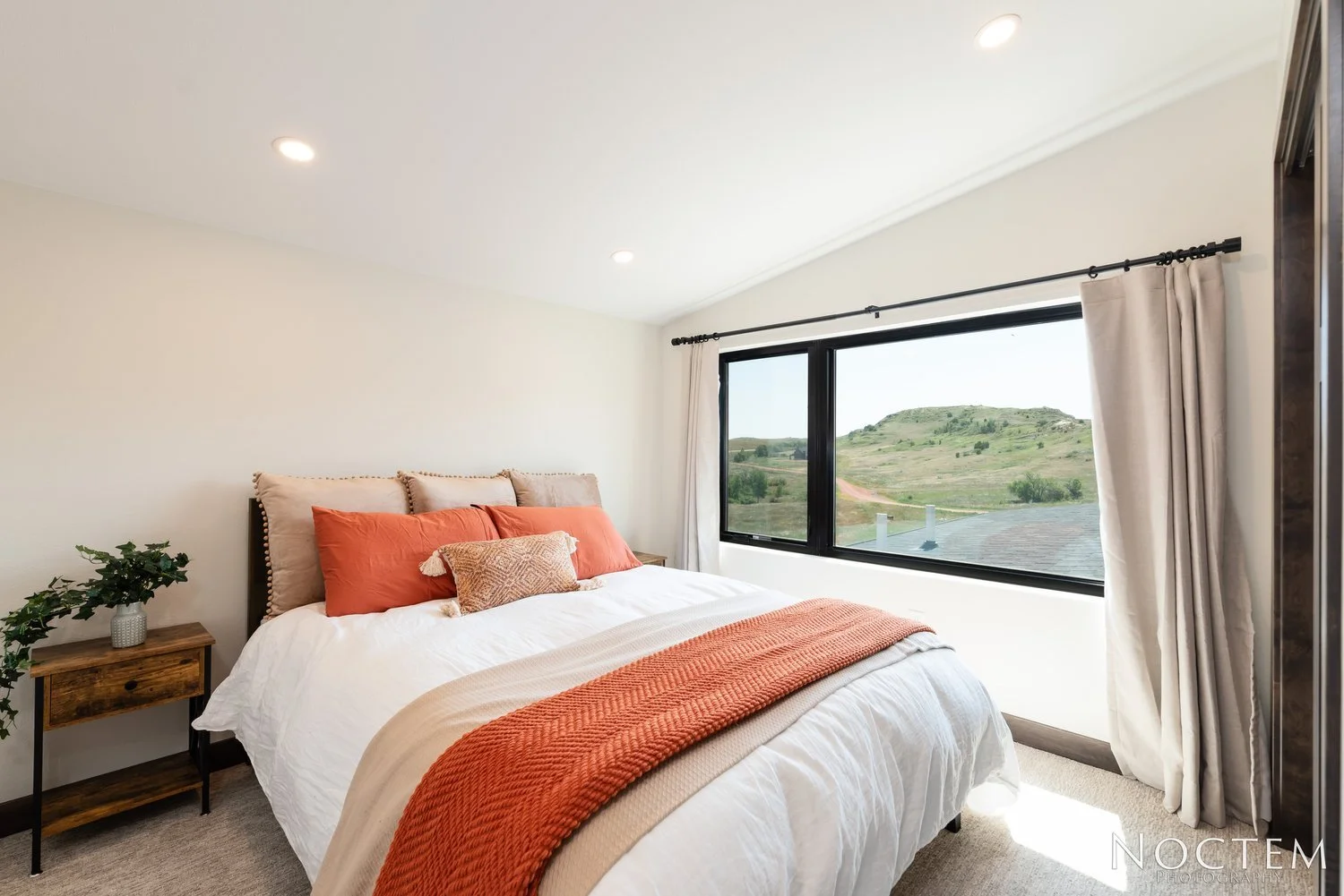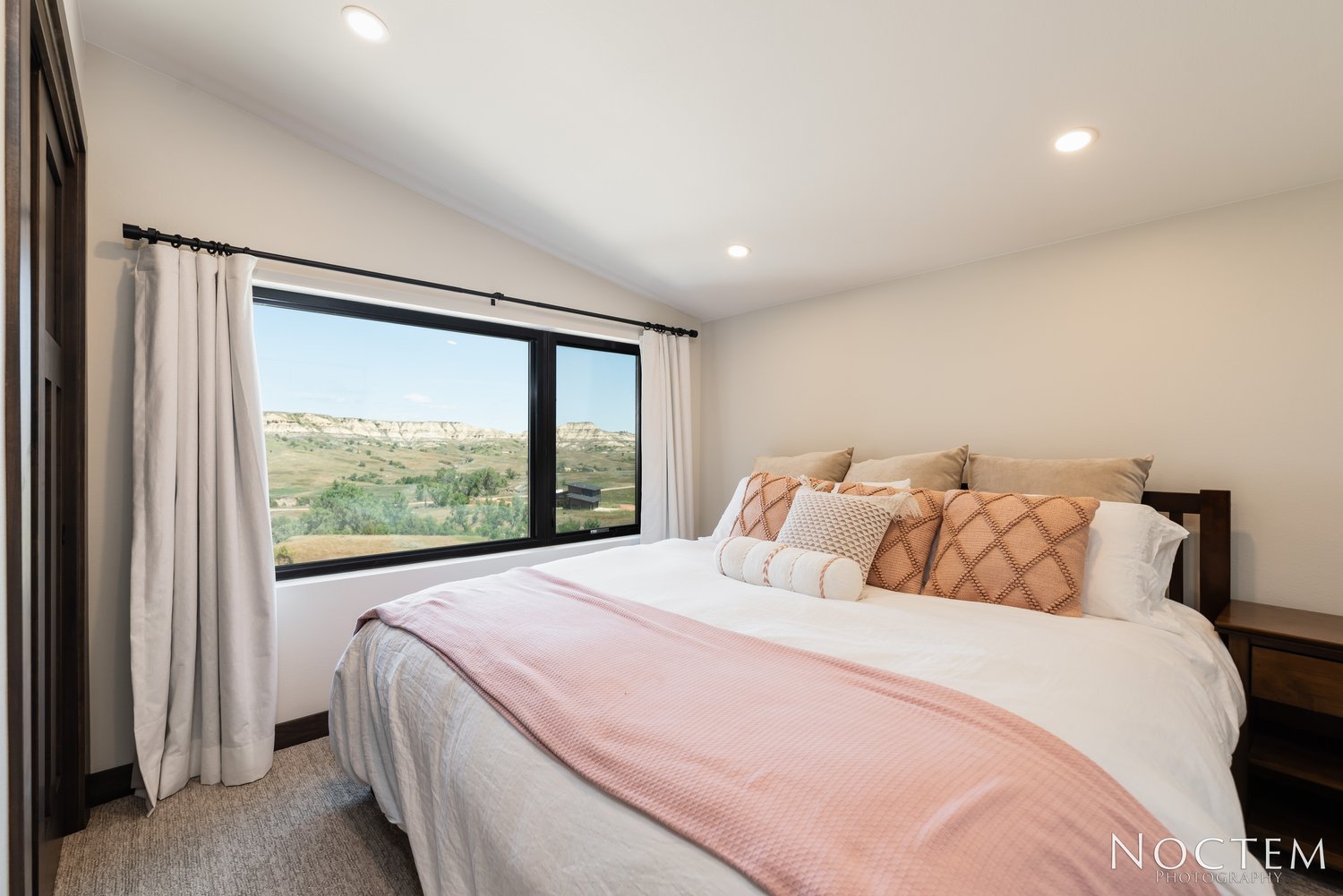 Large, cozy master bedroom with king bed, desk and beautiful views of the badlands
